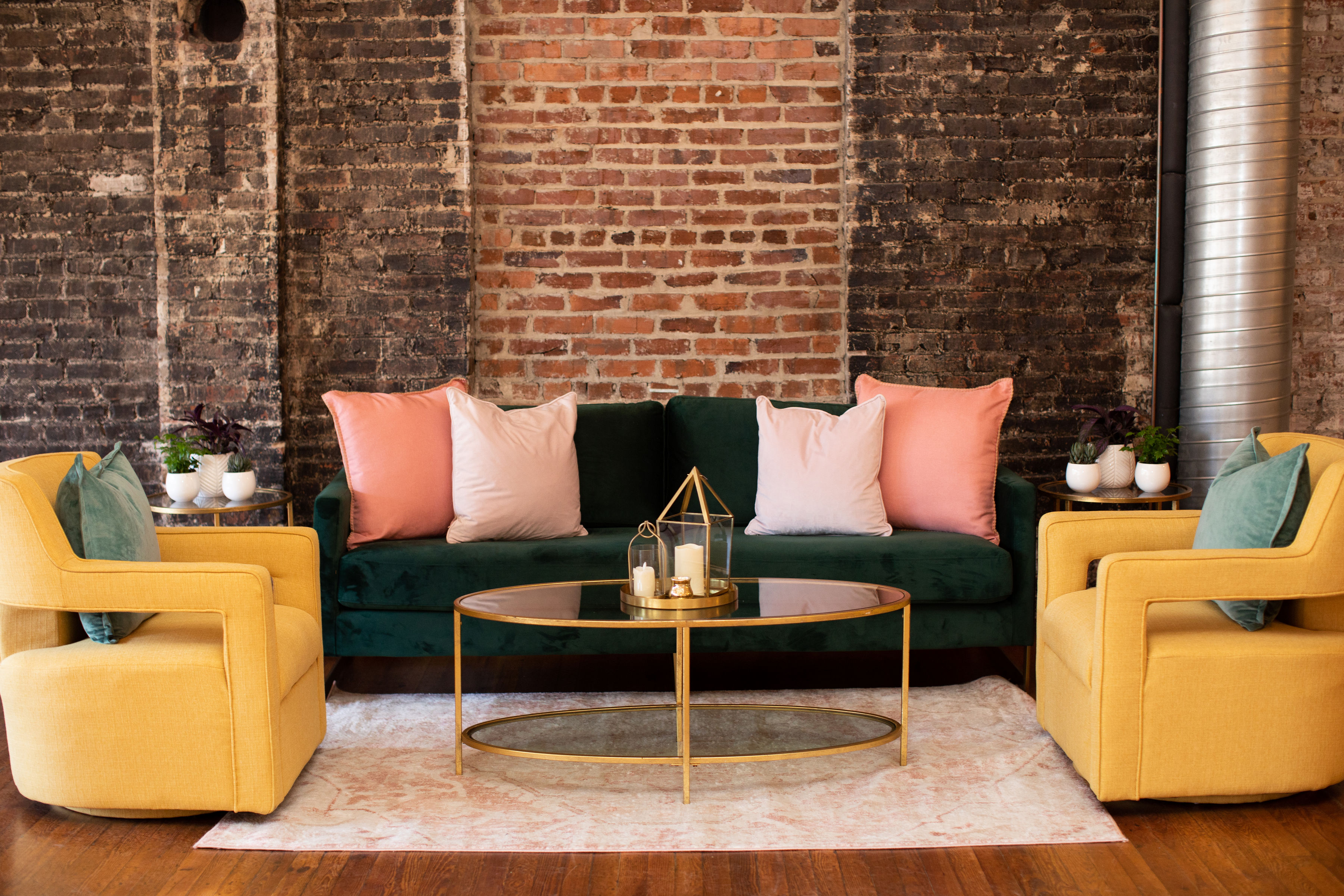 Tags: lounge, gold chairs, green sofa